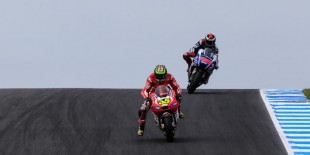 Pebalap Ducati asal Italia, Cal Crutchlow (depan), membalap di depan pebalap Movistar Yamaha asal Spanyol, Jorge Lorenzo, pada balapan GP Australia di Sirkuit Phillip Island, Minggu (19/10/2014).