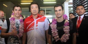 Pebalap Repsol Honda, Marc Marquez (kiri) dan Dani Pedrosa (kanan), berpose bersama Agustinus Indraputra (tengah) selaku General Manager Marketing Planning Analysis Division AHM saat tiba di Bandara Soekarno-Hatta, Cengkareng, Senin (20/10/2014).