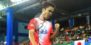 Pebulu tangkis yunior Indonesia Anthony Sinisuka Ginting berekspresi setelah meraih poin atas Kanta Tsuneyama dari Jepang pada perempat final BWF Wolrd Junior Championships di Alor Star, Malaysia, Rabu (16/4/2014). Anthony menang 21-13, 21-5, Rabu (16/4/2014).
