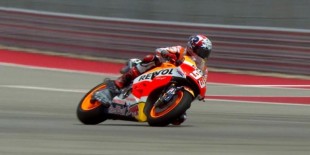 Pebalap Repsol Honda asal Spanyol, Marc Marquez, berlatih perpindah motor saat menjalani sesi pemanasan GP Americas di Austin, Minggu (12/4/2015).