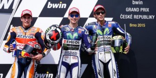 Pebalap MotoGP (kiri-kanan), Marc Marquez (Repsol Honda), Jorge Lorenzo (Movistar Yamaha), dan Valentino Rossi (Movistar Yamaha), berpose bersama setelah menyelesaikan sesi kualifikasi GP Ceko di Sirkit Brno, Sabtu (15/8/2015). Lorenzo mencatat waktu tercepat dan berhak atas pole position.