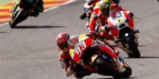 Pebalap Repsol Honda asal Spanyol, Marc Marquez (depan), memacu motornya pada balapan GP Aragon di Sirkuit MotorLand, Minggu (27/9/2015).
