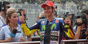 Pebalap Movistar Yamaha asal Italia, Valentino Rossi, merayakan setelah berhasil mengunci tempat start ketiga pada seri kualifikas GP Malaysia, di Sirkuit Sepang, Sabtu (24/10/2015).