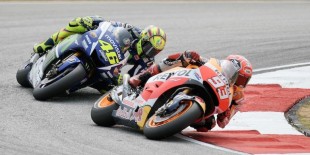 Persaingan antara Valentino Rossi (Movistar Yamaha) dan Marc Marquez (Repsol Honda) di Sirkuit Sepang, Malaysia, berakhir dengan menyedihkan.