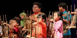 Ensembel angklung yang terdiri atas anak-anak Indonesia memainkan lagu Twinkle-Twinkle Little Star dalam Auckland Indonesia Festival 2015 di Raye Freedman Arts Centre, Auckland, Selandia Baru, Sabtu (28/3).