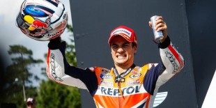 Pebalap Repsol Honda asal Spanyol, Dani Pedrosa, merayakan kemenangannya pada GP Ceko di atas podium Sirkuit Brno, Minggu (17/8/2014).