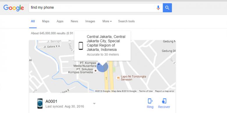 Hasilnya, mesin pencari Google akan menunjukkan peta yang menandakan lokasi ponsel dengan ikon lingkaran warna biru. Peta tersebut muncul di bagian teratas hasil pencarian.